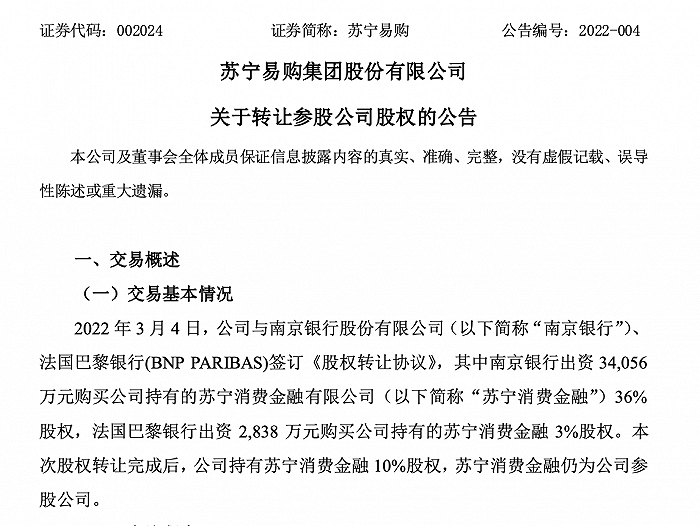 根据公告,从此交易金额约为3.69亿元。其中,南京银行出资3.4056亿元购买公司持有的苏宁消费金融36%股权,法国巴黎银行出资2838万元购买公司持有的苏宁消费金融3%股权。