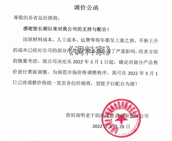 据自媒体“调料家”消息,调味品品牌“老干妈”对经销商发布了一份调价公函,从2022年3月1日起对部分产品销售价格进行重新调整。