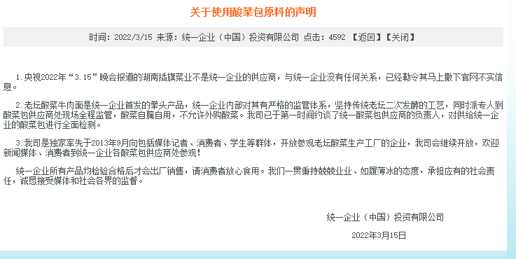 龙商网消息: 据统一企业中国官网,统一企业(中国)关于使用酸菜包原料的声明,央视2022年3.15晚会报道的湖南插旗菜业不是统一企业的供应商,与统一企业没有任何关系,已经勒令其马上撤下官网不实信息。老坛酸菜牛肉面酸菜自腌自用,不允许外购酸菜。我司已...