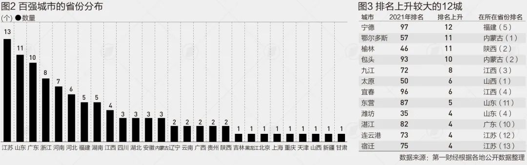 第一财经根据各地统计局公布的数据和公开报道梳理发现,2021年GDP百强城市经济总量达到79.8万亿元,占全国比重的69.8%。从省份分布来看,江苏13个城市全部进入百强,山东和广东分别有11个和10个。从排名变化来看,一些地级市表现十分突出,其中宁德排名上升了12个位次,鄂尔多斯、榆林上升10个位次。