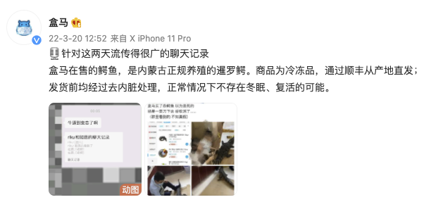 龙商网消息: 3月20日午间,盒马官微回应售卖活鳄鱼网络传言,称其在售的鳄鱼,是内蒙古正规养殖的暹罗鳄,商品为冷冻品,通过顺丰从产地直发;发货前均经过去内脏处理,正常情况下不存在冬眠、复活的可能。...