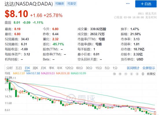 营收与两大核心平台都迎来增长,这推动着资本热情高涨。截止3月9日美股收盘,达达股价为8.1美元/股,大涨25.78%,总市值达到18.79亿美元。