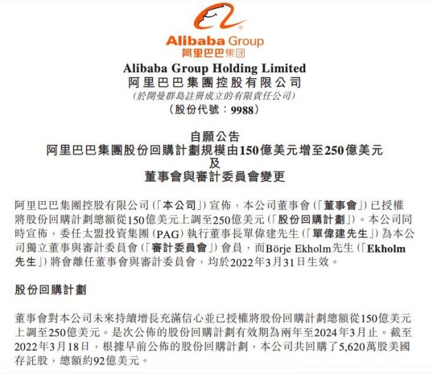 根据此前公布的回购计划,截至2022年3月18日,阿里巴巴共回购5620万份美国存托股(相当于约4.496亿股普通股),总额约92亿美元。