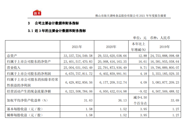 龙商网消息:海天味业披露年报,2021年实现营业收入为250.04亿元,同比增长9.71%;净利润66.71亿元,同比增长4.18%;基本每股收益1.58元。公司拟每10股派发现金股利7.6元(含税),每10股派送红股1股(含税)。