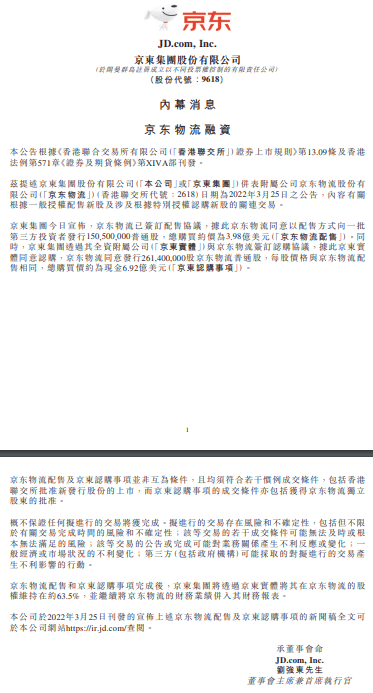 龙商网消息: 京东集团3月25日早间在港交所公告,京东物流已签订配售协议,据此京东物流同意以配售方式向一批第三方投资者发行150,500,000普通股,总购买约价为3.98亿美元。 同时,京东集团透过其全资附属公司(京东实体)与京东物流签订认购协议,据此京东...