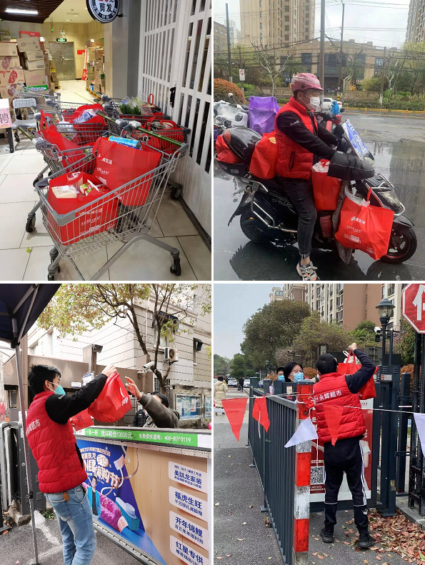 为了保障这批物资的顺利装箱,30多位员工从当日早上七点半工作至次日凌晨一点。23日,门店组织配送员进行配送,其范围覆盖了浦江全镇约42个社区、85个小区。政府订单加上散户配送单,最终永辉在当日达成了超5000份保供套餐的配送。