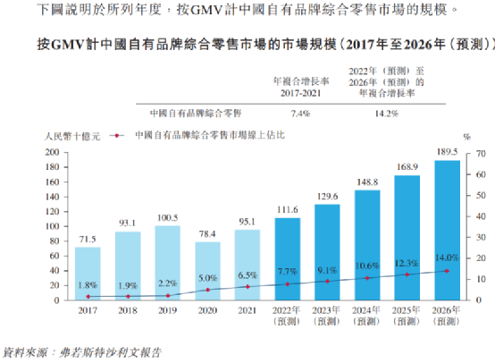 零售市场作为中国生活日用品市场的重要部分,中国自有品牌综合零售市场一直在快速发展。根据弗若斯特沙利文报告,按GMV计,中国自有品牌综合零售市场的规模由2017年的人民币715亿元增至2021年的人民币951亿元,年复合增长率为7.4%,且预计2022年至2026年期间将以14.2%的年复合增长率进一步增加。
