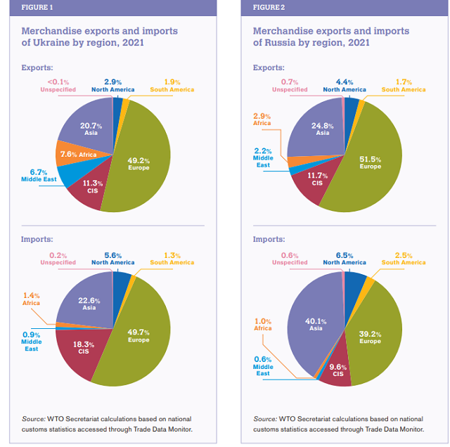 WTO表示,虽然俄罗斯和乌克兰在全球贸易和产出中的份额相对较小,但两国是重要产品的重要供应方,尤其是在食品和能源方面。