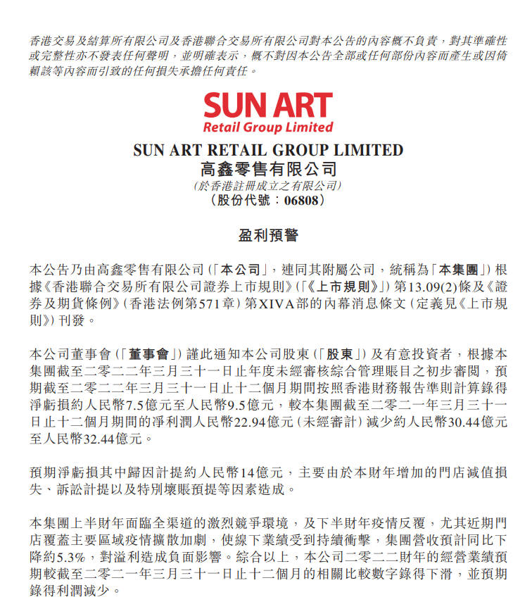 龙商网消息:高鑫零售在港交所公告,预期截至2022年3月31日止12个月期间按照香港财务报告准则计算录得净亏损约人民币7.5亿元至人民币9.5亿元,较上年同期减少约人民币30.44亿元至人民币32.44亿元。预期净亏损其中归因计提约人民币14亿元,主要由于本财年增加的门店减值损失、诉讼计提以及特别坏账预提等因素造成。