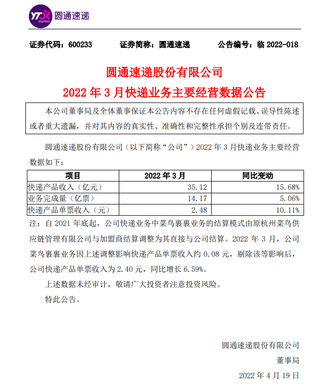 龙商网消息:圆通速递发布公告称,3月快递产品收入35.12亿元,同比增长15.68%;业务完成量14.17亿票,同比增长5.06%。