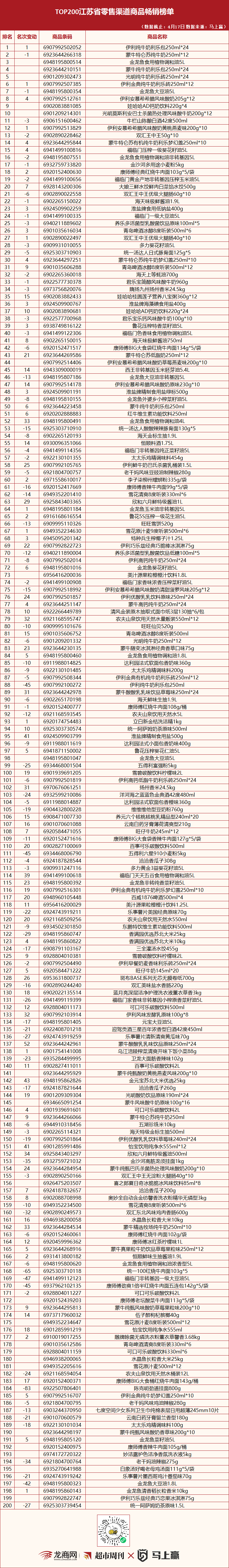 龙商网&超市周刊与马上赢联合发布:TOP200河南、江苏省零售渠道商品畅销榜单(4月17日版)