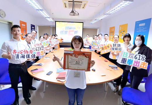 (图:苏宁家乐福徐泾店店长张微和团队同事在一起为此前618活动助力)