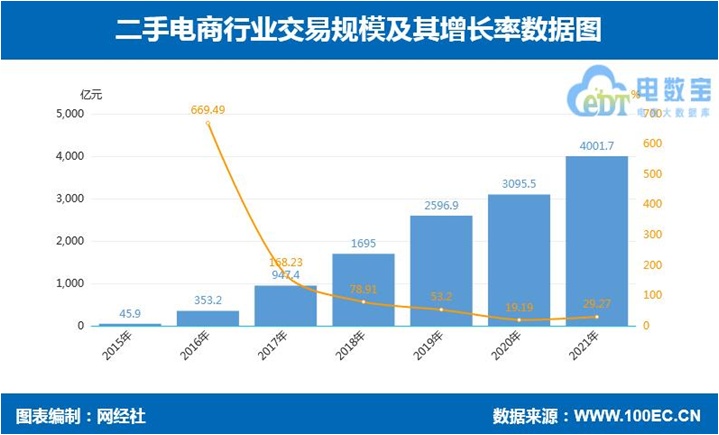 龙商网消息:4月2日,网经社发布《2021年度中国二手电商市场数据报告》。据网经社“电数宝”电商大数据库显示, 2021年我国二手电商交易规模达4001.7亿元,同比增长29.27%。此外,2016年增长率高达669.49%,2017年-2020年交易额(增速)分别为947.4亿元(168.23%)、1695亿元(78.91%)、2596.9亿元(53.2%)、3095.5亿元(19.19%),增速持平缓下滑。