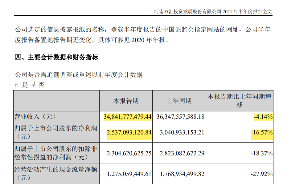 双汇2021年半年报