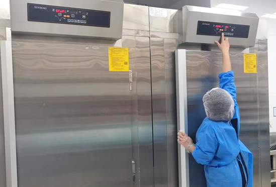 (图:家乐福会员店烘焙主管马雪清将面包生胚放入醒发炉,并设置醒发时间和温度)