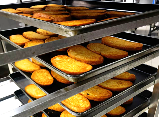 (图:新鲜出炉的面包在烤架上,等待包装)