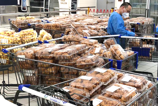 (图:家乐福会员店各类烘焙套餐产品正在购物车中分类整理准备打包)