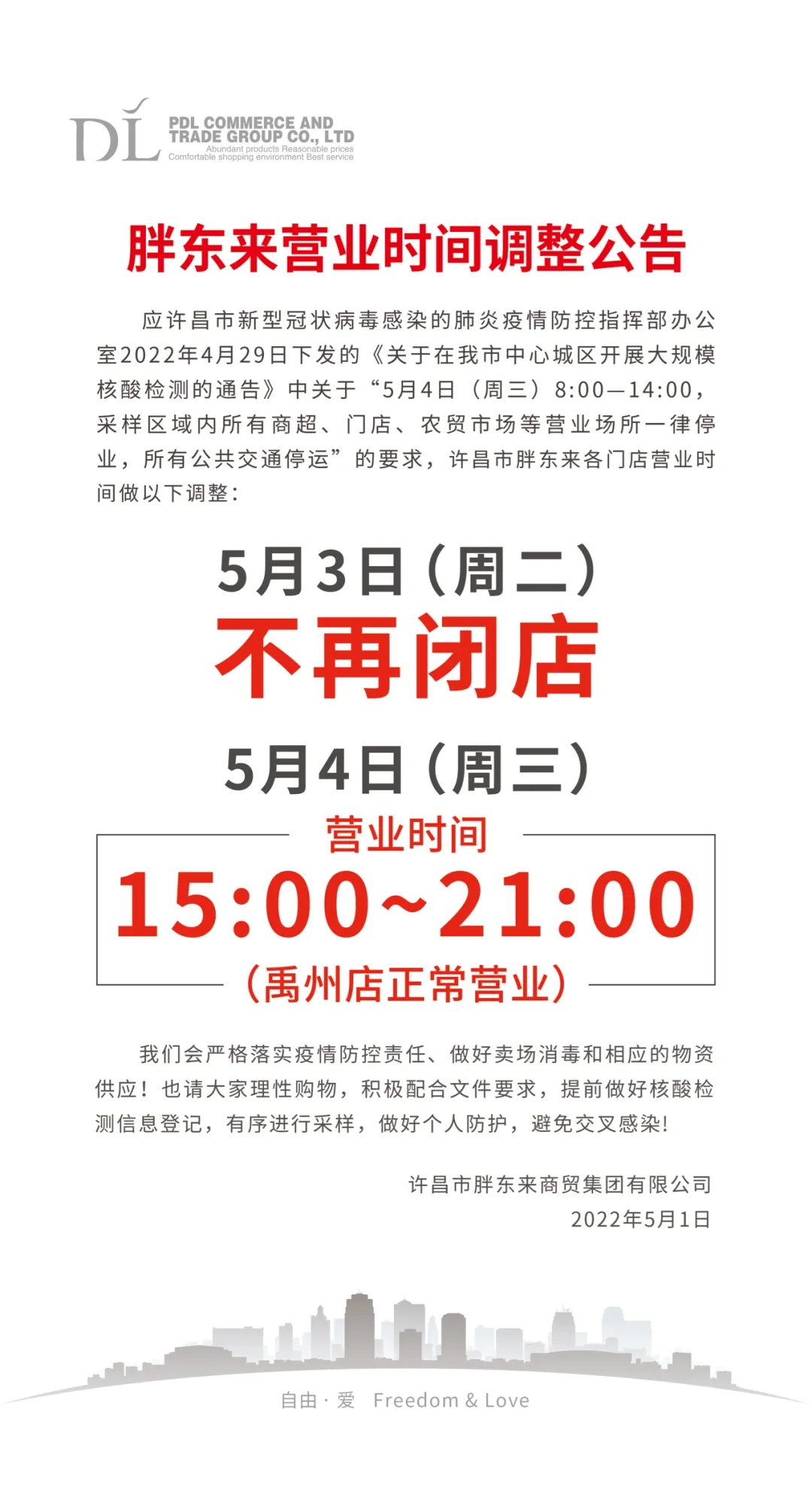 龙商网消息:应许昌市新型冠状病毒感染的肺炎疫情防控指挥部办公室2022年4月29日下发的相关通告要求,许昌市胖东来发布营业时间调整的公告,对各门店营业时间做了相应调整,以下为胖东来营业时间调整公告的具体内容。