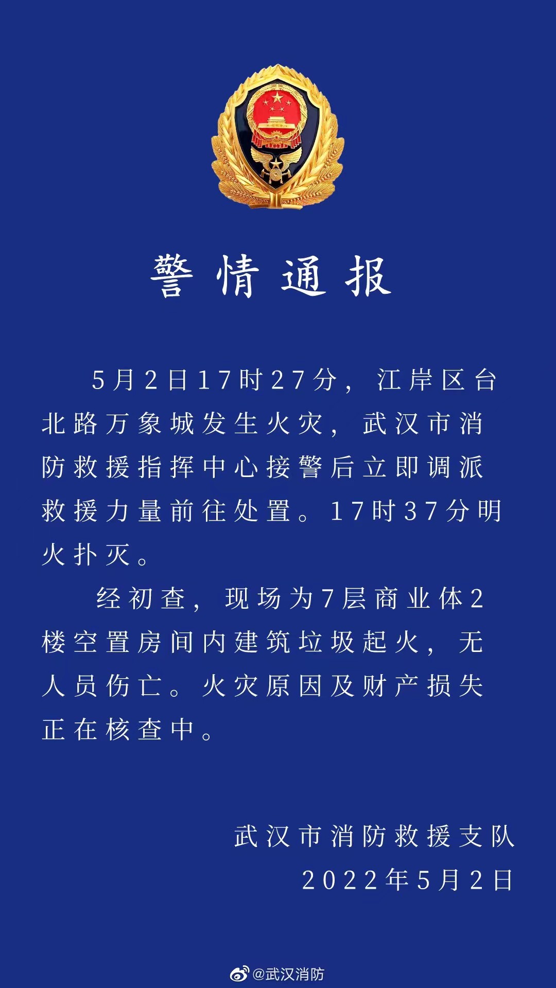 经武汉市消防救援指挥中心初查,本次火灾现场为7层商业体2楼空置房间内建筑垃圾起火,无人员伤亡。火灾原因及财产损失正在核查中。