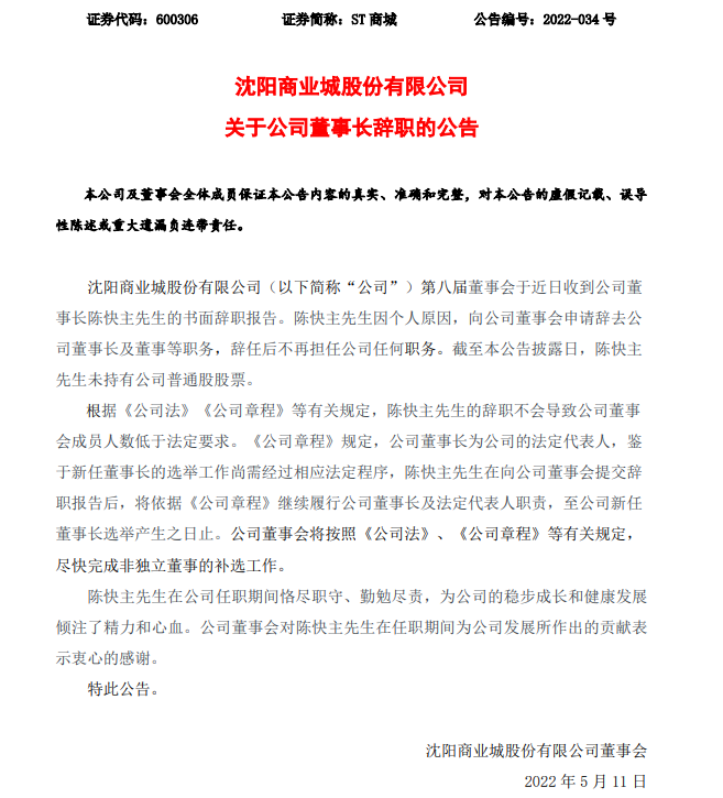 龙商网消息:5月11日,沈阳商业城发布公告宣布,陈快主先生因个人原因,向公司董事会申请辞去公 司董事长及董事等职务,辞任后不再担任公司任何职务。