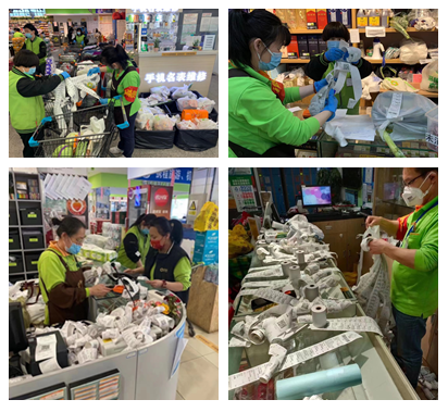 5月9日起,海淀区安宁佳园小区采取临时封控管理。得知消息后,超市发清河店第一时间与社区对接,紧急为封控社区调拨配送手推购物车,支援社区工作人员为居民配送生活物资使用。同时,依据封控社区需求超市发清河店快速组织人员将医用口罩、矿泉水等物资配送至封控社区,并与公司协调沟通,加大连锁店货源储备,确保商品供应充足,价格稳定。
