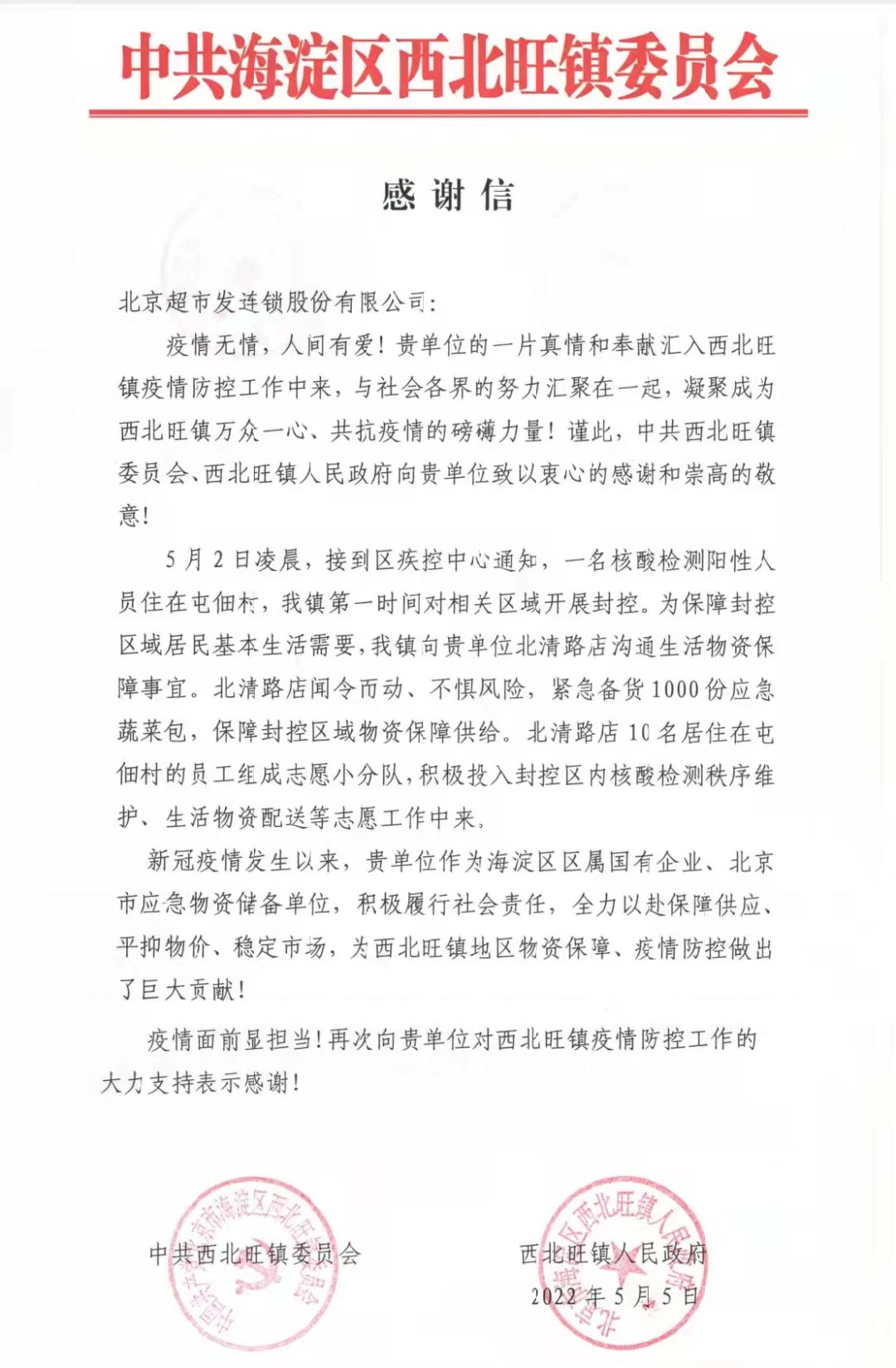 5月2日凌晨,西北旺镇屯佃村采取封控管理,超市发北清路店10名被封控员工请缨出战、自发保供,主动联系村委会承担起封控区志愿者工作。每天为封控居民提供千余份“生活应急包”供应,满足居民日常生活所需。