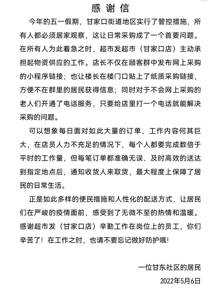 疫情当前,超市发将继续坚定有力、毫不懈怠地做好“保供、保量、保质、保秩序”工作。我们相信前路光明,阴霾终会散去,超市发人团结一心,再鼓干劲、坚持下去,一定能取得抗疫最后胜利!超市发加油!北京加油!