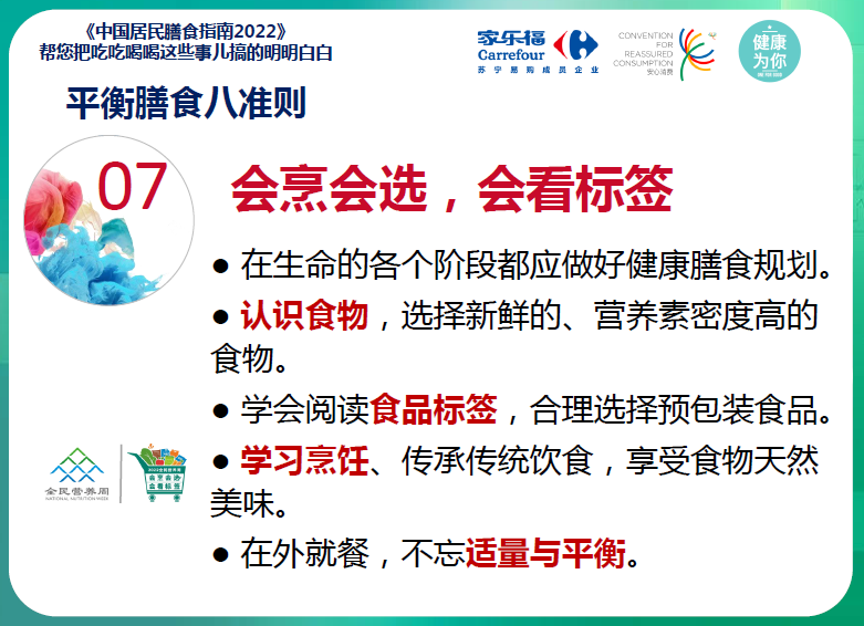 会烹会选 会看标签,随着5月15日至21日我国第八个全民营养周在全国拉开帷幕,吃饭这件小事儿再次被重点提起。 (图:家乐福门店全民营养周膳食指南科普) 如何才能吃得营养、安全、健康,这更是一门学问。作为始终关注消费者营养健康的零售企业,家乐福紧跟...