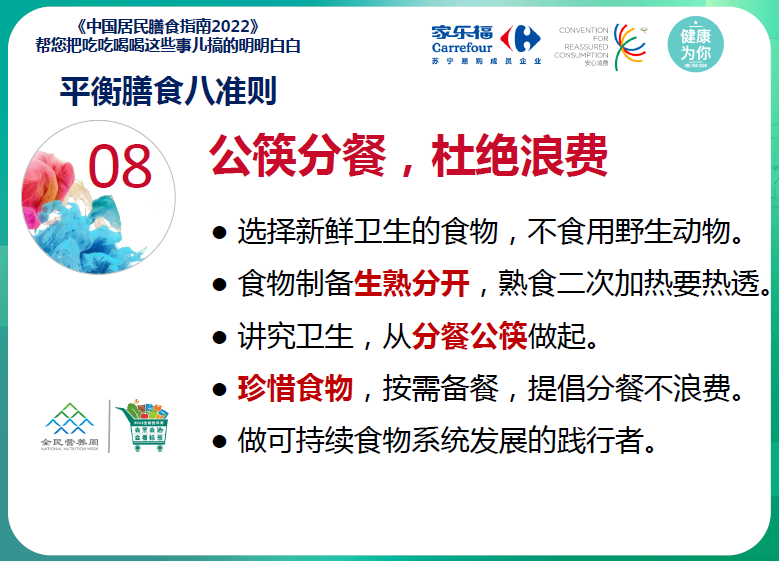 据了解,自“全民营养周”活动2015年首届举办以来,家乐福已连续八年在全国各门店积极开展本项活动,多次携手中国营养学会、中国连锁经营协会和消费品论坛等专业机构为消费者提供专业营养健康购物指导。今年 “全民营养周”,正值中国营养学会最新发布《中国居民膳食指南(2022)》,因此家乐福在对消费者科普方面,以新版指南的“平衡膳食八准则”为主,结合家乐福原有的“健康指导货架”陈列,重点对“平衡膳食八准则”中的核心知识点进行推广,强调膳食模式、饮食卫生、三餐规律、饮水和食品选购、烹饪的实践能力。