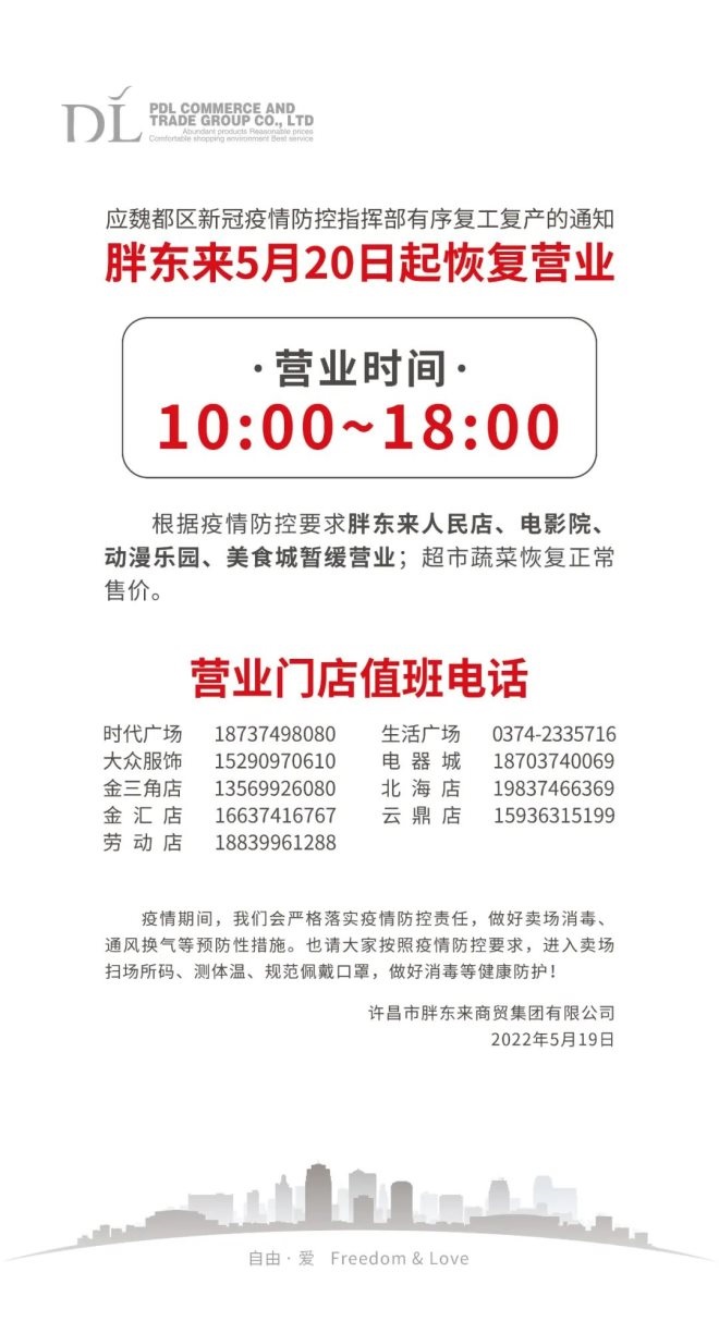 龙商网消息:5月19日,胖东来发布公告称,应许昌市魏都区新冠疫情防控指挥部有序复工复产的通知,胖东来5月20日起恢复营业,营业时间为10:00-18:00。