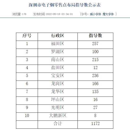 5月20日电,记者从深圳市烟草专卖局获悉,《深圳市电子烟零售点布局规划》昨日正式发布,深圳市电子烟零售点布局指导数为1172,自5月20日起开始生效。文件中还指出,因向未成年人销售电子烟或通过信息网络销售电子烟被行政处罚未满三年的,不得从事电子烟零售业务。