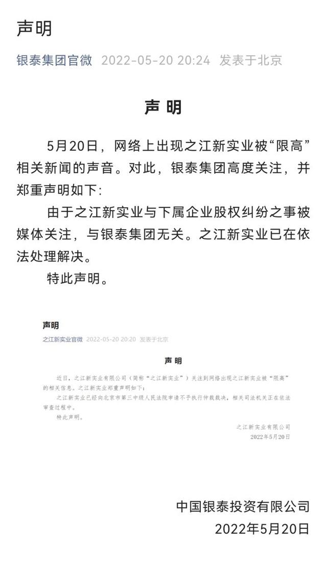 龙商网消息: 5月20日,因未按执行通知书指定的期间履行生效法律文书确定的给付义务,之江新实业及单位法定代表人沈国军被限制高消费。当日晚间,银泰集团发布了相关声明表示:由于之江新实业与下属企业股权纠纷之事被媒体关注,与银泰集团无关。之江新实业...