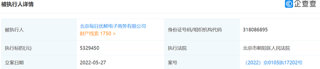 龙商网消息: 企查查显示,北京每日优鲜电子商务有限公司被北京市朝阳区人民法院列为被执行人,执行标的532.95万元,案号为(2022)京0105执17202号。 北京每日优鲜电子商务有限公司于2014年10月30日成立,法定代表人为曾斌,注册资本31.95亿元。公司经营范...