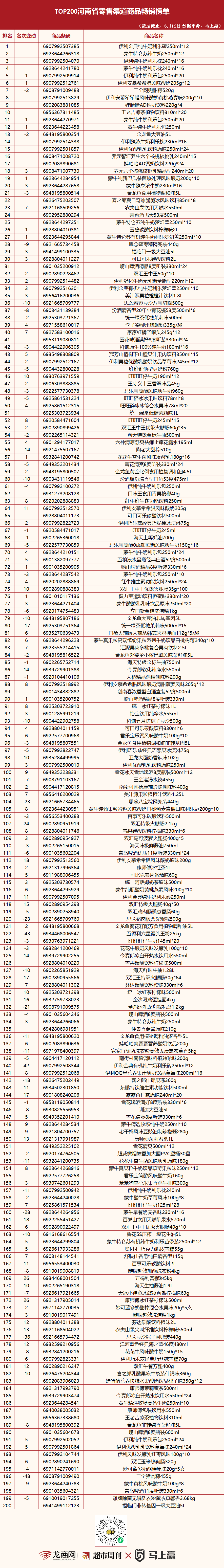 “TOP200河南省零售渠道商品畅销榜单”发布(3月6日版)
