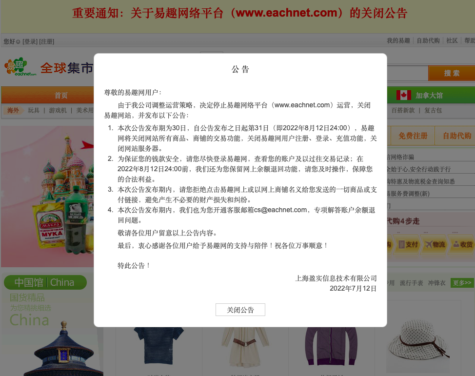 公告显示,本次公告发布期为30日,自公告发布之日起第31日,即2022年8月12日24:00,易趣网将关闭网站所有商品、商铺的交易功能,关闭易趣网用户注册、登录、充值功能,关闭网站服务器。公告提醒用户,为保证钱款安全,请用户尽快登录易趣网,查看账户及以过往交易记录;在2022年8月12日24:00前,平台还为用户保留网上余额退回功能,请用户及时操作,保障合法利益。