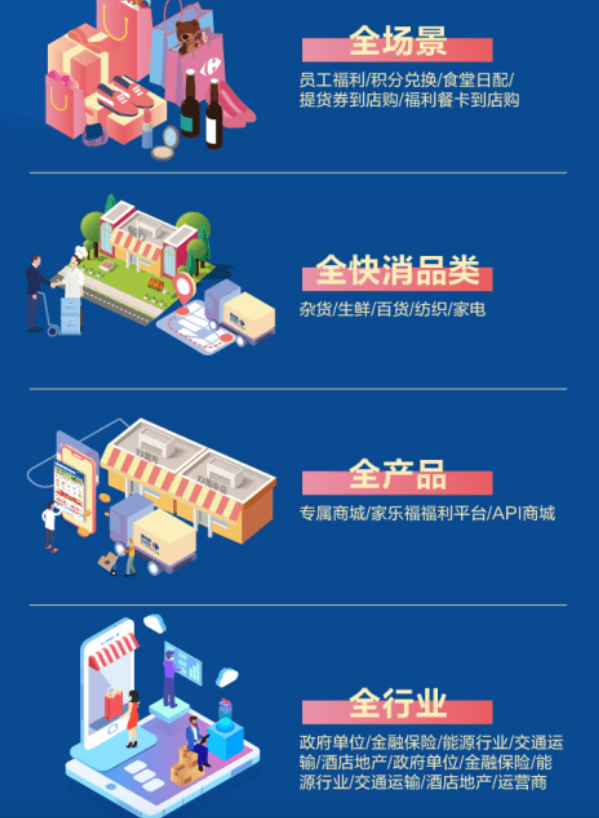 具体的业务模式创新,家乐福易采云主打“全场景、全快消品类、全产品、全行业”四全。全场景即员工福利、食堂日配等等政企采购场景;全快消即覆盖杂货、生鲜、百货等等消费品类;全产品则为针对客户提供的丰富的数字化产品专属商城、API商城等;而全行业则意味着,家乐福易采云的服务行业范畴也是全覆盖。