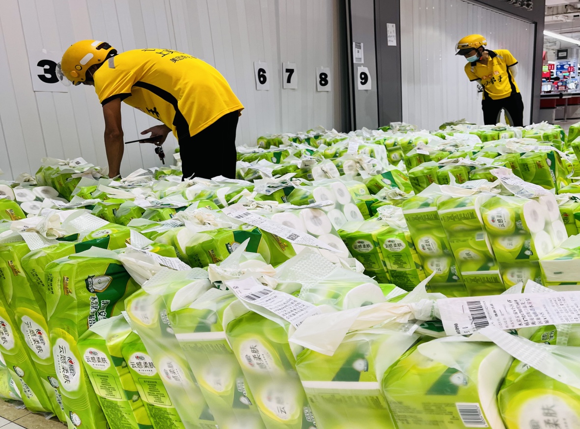 “你们这个纸巾是多少钱啊?怎么这么多人下单”外卖小哥一边快速拣货打包,一边好奇地寻问正在大量出货的家乐福工作人员小李。在得知目前该活动满减力度超大,每卷合计只有2块多钱,小哥说我也来“薅个羊毛”。