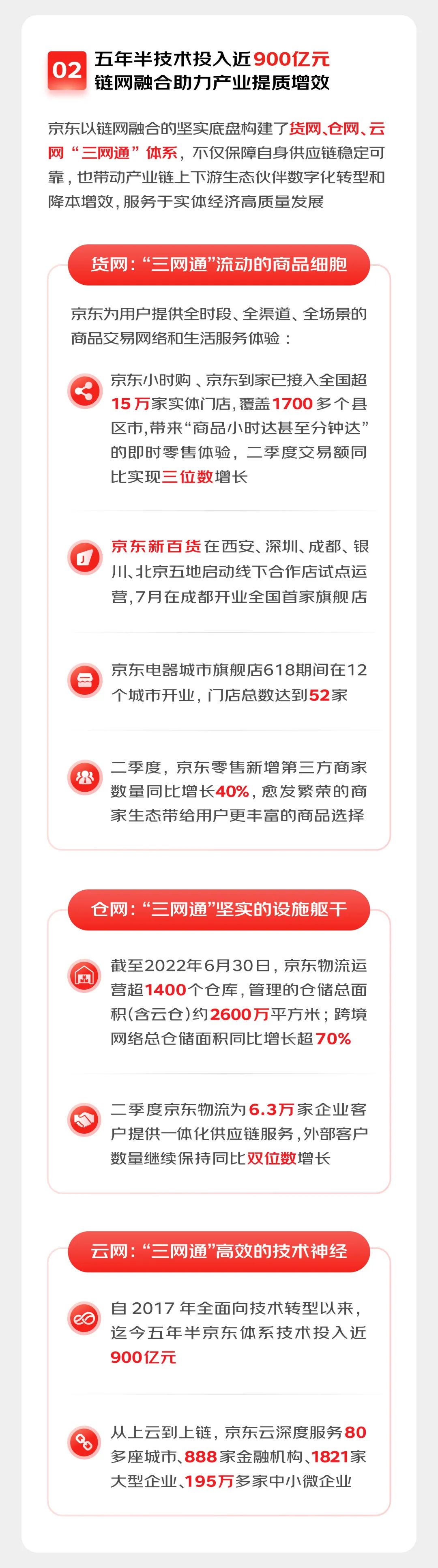 二季度,京东的核心零售业务的年度活跃用户数环比净增超过1000万,包括DAU(日均活跃用户数)、用户购物频次和ARPU(用户平均贡献收入)等也在同步提升,其中,二季度DAU同比增速达到25%。截至2022年7月,京东PLUS会员在籍会员数量已突破3000万,较去年底新增了500万,持续成为行业内规模最大的付费会员体系。