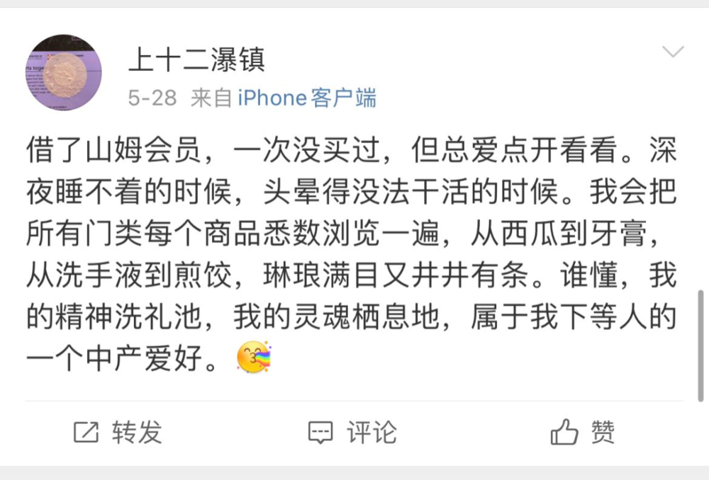 “它用自己的力场扭曲了我到中产之间的距离,普通超市总是在说,我的货有多么好,但山姆让我觉得,不论多好的货,也不过是稀松平常的生活。”