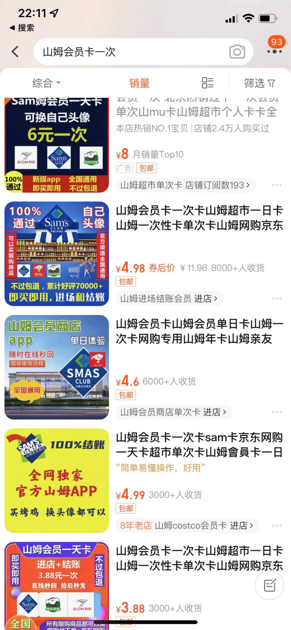 在闲鱼或者淘宝搜索“山姆会员卡一次”,会刷出好几屏的卖家,其中销售量最高的,一个月能卖出8000余张。