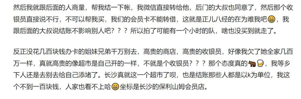 随着山姆的出圈,大量的借卡、次卡、代购也随之而来,原有会员的购物体验有所缩水,这不禁让中产想念起自己是山姆“原教旨”客户群的日子。