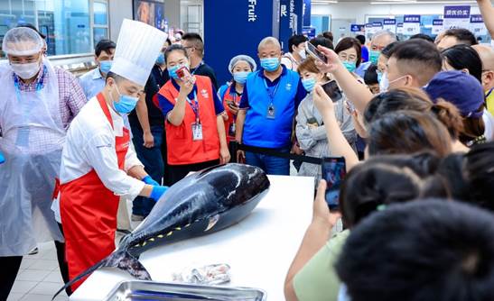 (图:9月2日,家乐福会员店南翔店开业当天,日本蓝鳍金枪鱼开鱼)