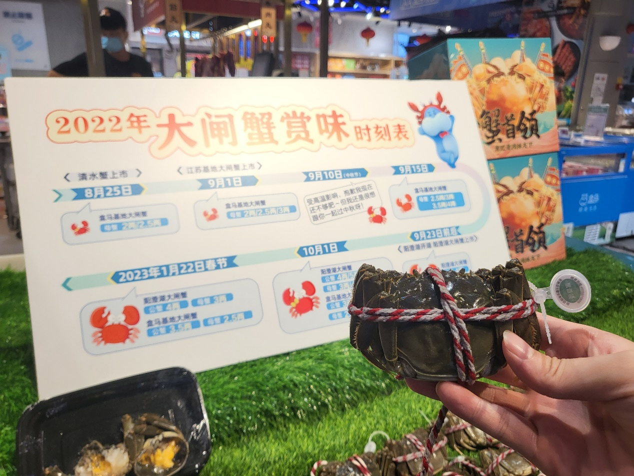 同时,盒马还发布了一份《2022年大闸蟹赏味时刻表》,为心急难耐的顾客呈现了一份清晰的吃蟹指南:国庆前后,更多产区和更大规格的公蟹母蟹会大量上市,目前还是以2-3两的蟹为主。