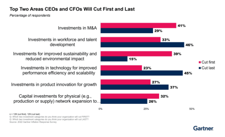 公司已将这些数据牢记在心,Gartner 最近对各行各业的财务主管进行的一项调查显示,随着经济努力防止近期通胀导致新的衰退,对技术和劳动力发展的投资是公司计划削减的最后一笔费用。Gartner 的数据显示,合并预算、环境可持续性计划甚至产品创新都在退居二线。