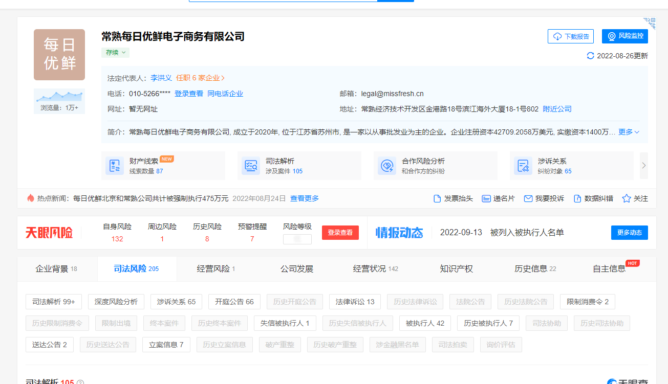 天眼查App显示,近日,常熟每日优鲜电子商务有限公司新增两条被执行人信息,执行标的总计81万余元,执行法院分别为深圳前海合作区人民法院、常熟市人民法院。截至目前,该公司已存在41条被执行人信息,被执行总金额超4770万元。信息显示,该公司成立于2020年...