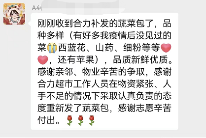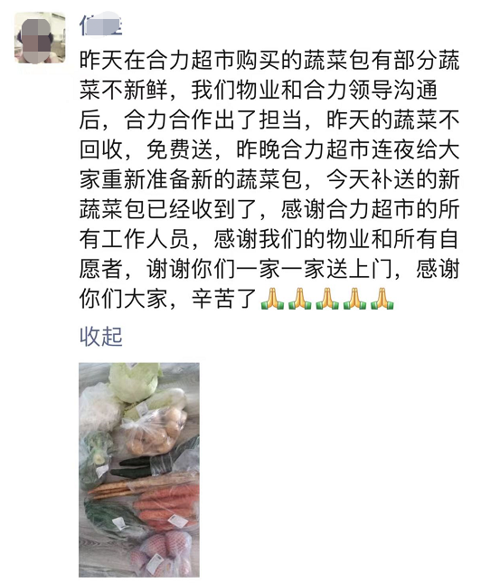 “陈经理,谢谢你,我们小区居民终于收到蔬菜包了,大家反馈品质好,价格实惠,真的非常感谢你们,感谢合力超市……”