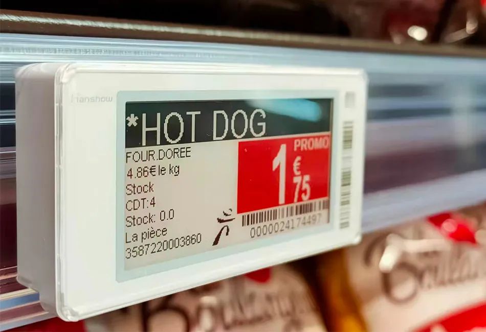 Les Mousquetaires集团应用的汉朔Stellar系列电子价签具备多页面定制模板功能,能够根据门店需求定制显示页面模板。模板中可包含商品价格、促销活动、库存、订货日期和交付日期等商品信息,支持黑、白、红三色,通过颜色组合突出重点销售信息。