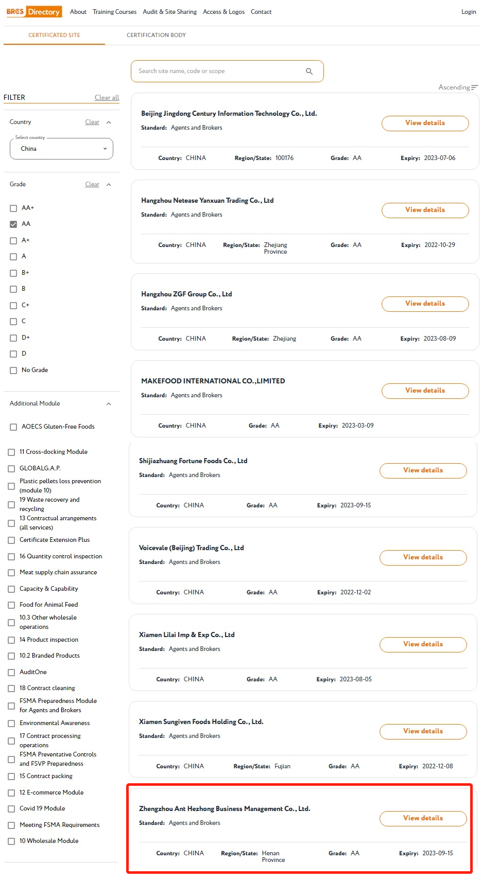 截至2022年10月,BRCGS官网上公布的全球BRCGS A&B认证企业共有751家,中国仅有57家企业通过认证,其中等级达到AA级的企业,全球共有598家,中国仅有9家,京东商城、网易严选、元初食品等知名企业均在其列。