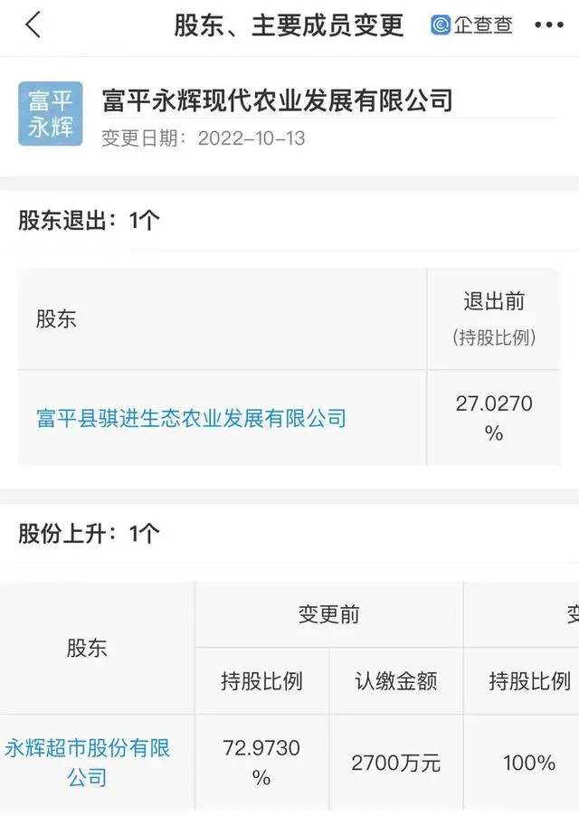 龙商网消息: 10月13日,企查查信息显示,富平县骐进生态农业发展有限公司转让富平永辉现代农业发展有限公司27.03%股权,由永辉超市(601933)股份有限公司接盘。股权变更前,富平永辉现代农业的大股东为永辉超市,持股72.97%;骐进生态农业持股27.03%。股权变...