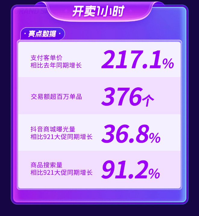 龙商网消息: 11月2日,抖音双11好物节10月31日0时正式开启。本次抖音双11好物节主打抖音商城阵地,站内大促氛围火爆。仅开卖1小时,支付客单价相比去年同期增长217.1%;抖音商城曝光量相比921大促同期增长36.8%;商品搜索量相比921大促同期增长91.2%。从货...